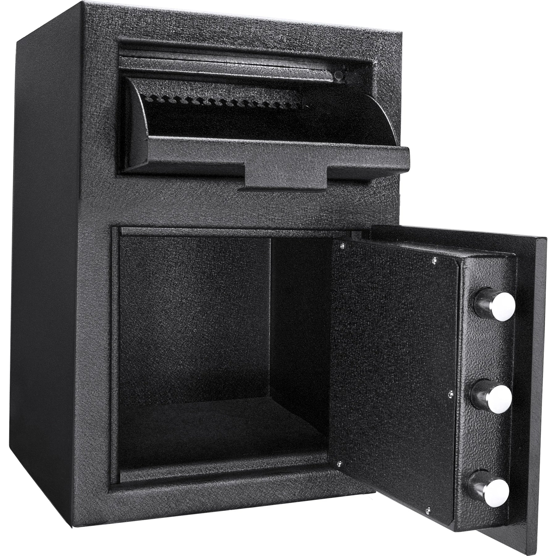 - Three steel deadbolts set in the anti-pry door help ensure that the depository safe door can only be opened when the correct PIN code is inputted.